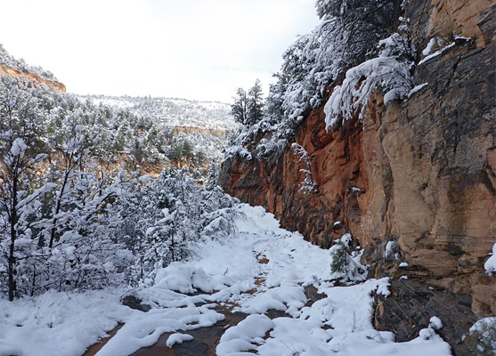The closest section to the east end is also good for shorter walks - it climbs up the scenic upper canyon of Clear Creek and the narrower tributary of Cave Canyon, then continues to the brink of Jolley Gulch, a deep, sheer-sided ravine that starts with a dramatic pour-off. This point is 3 miles from the start, approximately one third of the whole trail; beyond, the less travelled middle section crosses a high plateau with meadows and ponderosa pine forests, past two junctions, one with a link path from Zion Ponderosa Ranch Resort, the other with the trail to