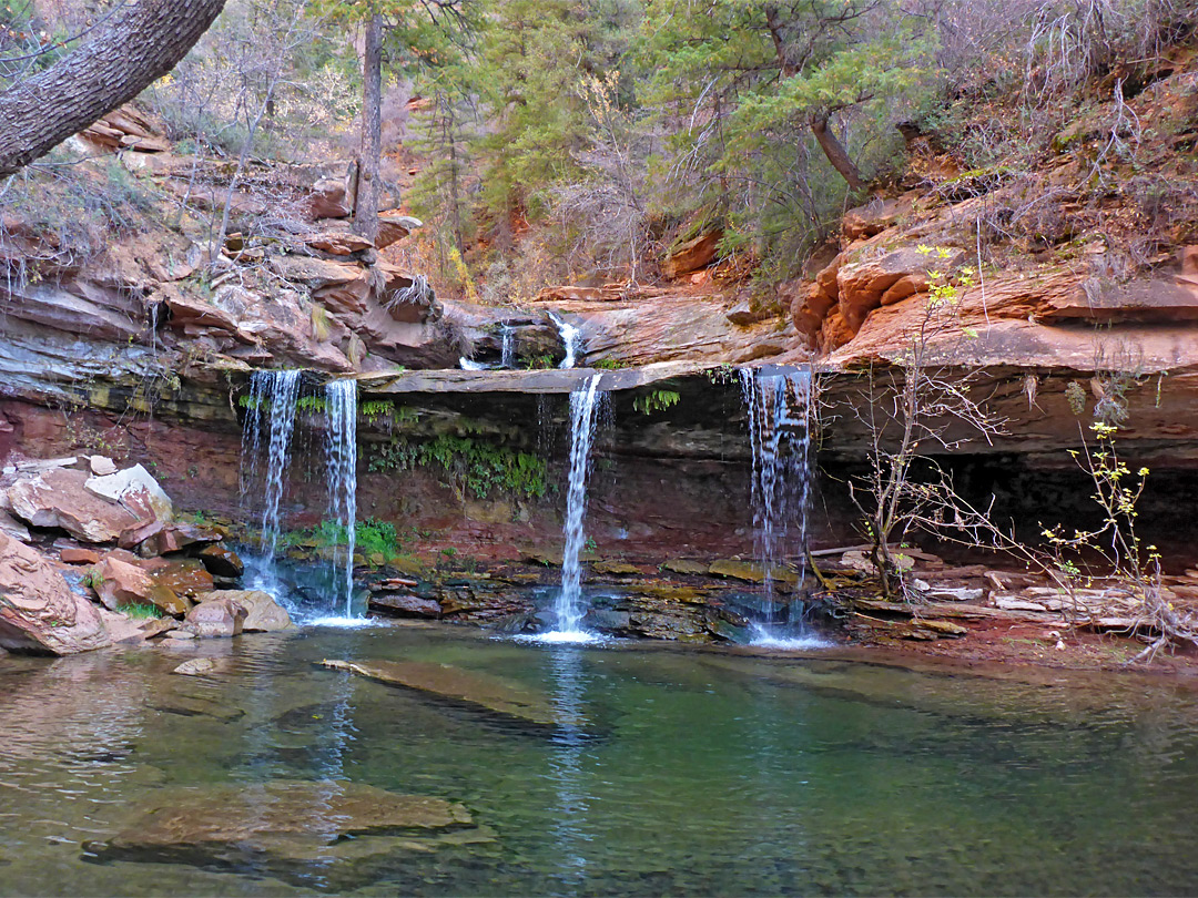 Elongated waterfall over a narrow, red rock ledge - Double Falls