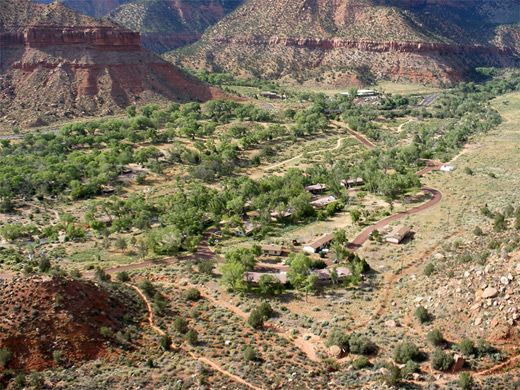 The best place to park is the main lot by the visitor center; the path begins just opposite the shuttlebus stop, first running alongside the Virgin River for a short distance then crossing a service road and a range of low hills, before starting a steady climb up the north side of a ravine. The trail has quite a respectable upwards gradient as it ascends the hillside, which is composed of red, ledgy sandstone of the Kayenta Formation and bears mixed, desert-like vegetation of small bushes, pinyon pines, yucca and cacti. It reaches a narrow part of the ravine at the edge of a plateau, crosses the streambed (usually kept moist by several seasonal springs nearby) then heads back southwest along the rim, descending slightly to the viewpoint by the edge of the promontory, where the path ends.
