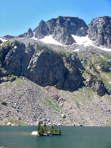 Lake Solitude, attractively situated in a glacial bowl at the head of the canyon, enclosed by steep, rocky slopes on three sides. This is the hike destination for most people who walk this far, since the path now climbs by 1,500 feet over the next 2 miles, initially up a grassy hillside and then a scree slope formed of loose, sharp rocks, heading east for most of the ascent but cutting back west near the top, over more boulders towards