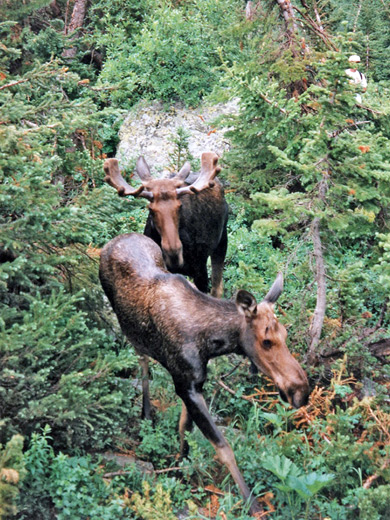 The first location of interest in Cascade Canyon is Hidden Falls, half a mile from the boat arrival dock, and 400 feet above the lake. The falls are an impressive whitewater cascade that is indeed largely hidden from the trail as it continues up a steep, exposed section of cliff face to a treeless promontory (Inspiration Point), which has nice views over Jenny Lake and the Snake River valley towards the Wind River Mountains on the horizon. Beyond here the land becomes fairly level as the path traverses a patch of woodland, then emerges into the wide, lower part of the canyon, where much of the ground is covered by large white granite boulders, broken off the cliffs high above. Cascade Creek runs close by, through shallow pools and calm channels, unlike the steep, fast flowing lower portion. After another half mile the stream splits into different courses and forms larger pools, bordered by quite extensive bushes and other undergrowth; this is one of the most likely places to see moose.