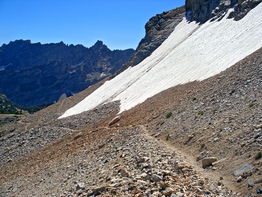 The ridge is not Paintbrush Divide, however, as the path still has another 600 feet to climb, up an angled scree slope above a small glacier, a section that is usually snow-covered and may be difficult to cross (an ice axe and/or crampons may be required in early to mid summer), followed by the rockiest part of the trail, zig-zagging up a pile of loose, broken boulders to the 10,700 foot high point of the divide, soon after which