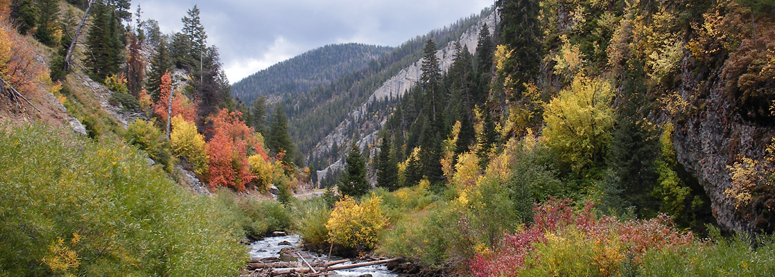 Salt River Range) for 4 miles to a parking area, where the track ends. For most of the way, the road parallels a large, green, newly constructed water pipe, which provides an improved supply to the nearby town. Some sections of the canyon walls show impressively jagged rock formations, composed of twisted strata inclined near vertically, though most is covered by dense forest - a mixture of fir, oak and aspen, some of which turn bright red/orange colors in the fall.