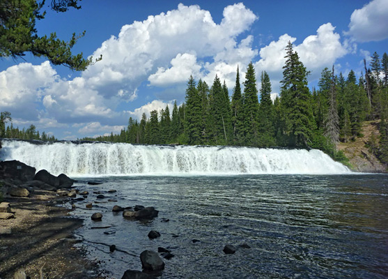 Sheep Falls. There are three small parking areas for the hike; at road's end, with space for a dozen or so vehicles, at a nearby overlook of Cave Falls, and at the end of a very short side track to the base of the falls. One other trail starts here, connecting with the Bechler Ranger Station (3 miles west), which passes nothing of great interest but does form part of several longer loop hikes.