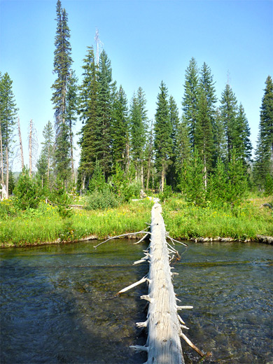 A short diversion northeastwards along this route soon reaches the Bechler River, much of which is rather deep, but is forded here across a relatively shallow section, beyond which the path soon enters the long Bechler River canyon, site of many more waterfalls including Colonnade, Iris, Ragged and Twister. There are several small thermal pools off trail upstream along the river (west side), close to the ford. Heading south, the Bechler Meadows Trail crosses the central portion of the meadows for about 2 miles, at one point crossing a muddy slough a couple of times, the second via a fallen trunk, and eventually reaches Boundary Creek once more. The stream is rather deep at this point so the crossing is via a narrow suspension bridge, usable by only one person at a time. This marks the edge of the meadows, as beyond the trail returns to the forest and the scenery is little changing and somewhat monotonous for 1.5 miles, back to the junction with the Boundary Creek Trail, from where the ranger station is 1.5 miles further.
