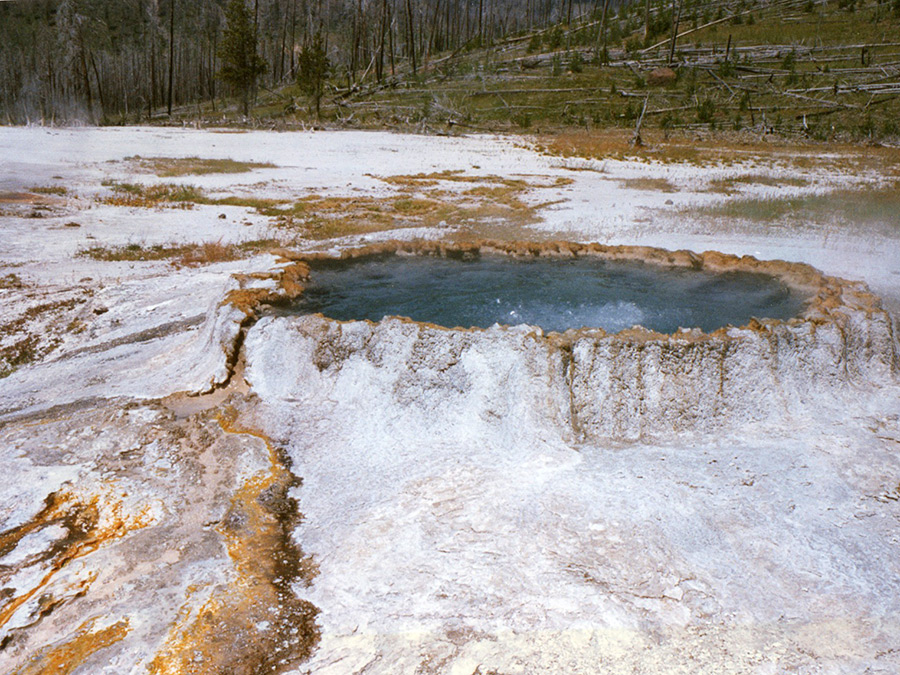 Punch Bowl Spring is reached by a short side trip on the trail leading west from the Daisy Group loop; it stands alone in partly wooded terrain. The spring is surrounded by a neat, raised sinter rim 8 feet in diameter, resembling a punch bowl. The waters bubble and boil near continuously, splashing over a slightly shallow part of the rim and flowing along an orange, algae-lined channel. The spring is thought never to have erupted. There are no other major thermal features hereabouts; the tour continues by walking east, back to the Daisy Group.
