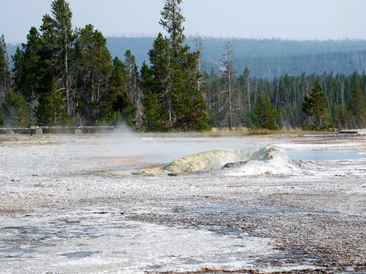 Anemone Geyser is circled by delicate sinter formations and discharges about every 10 minutes to heights of 10 feet, with a second, smaller vent also frequently active.
