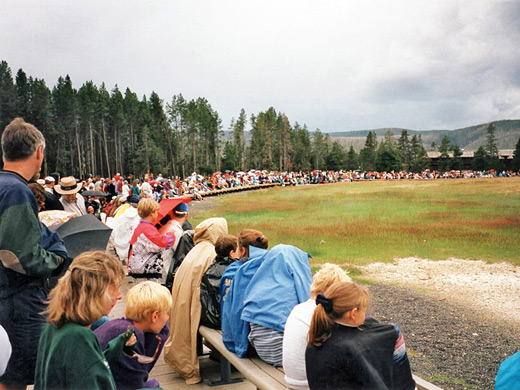 Old Faithful was named by the 1870 Washburn Expedition, the first modern day explorers of this region, on account of its regularity, discharging as it does every 45 to 90 minutes to heights of 180 feet, with the interval proportional to the duration of the previous eruption, though this geyser is none of the tallest, most impressive, prettiest or most frequently erupting. But it is definitely the most watched since it is right next to the carpark, the visitor center and Yellowstone Lodge. The geyser is half encircled by a curved, raised viewing area, 300 feet from the vent, allowing up to 2,000 people to see the performance, and the full compliment are often present on busy days in midsummer. Depending on the amount of steam and the wind direction, Old Faithful may be difficult to photograph effectively; the best views are often from above at